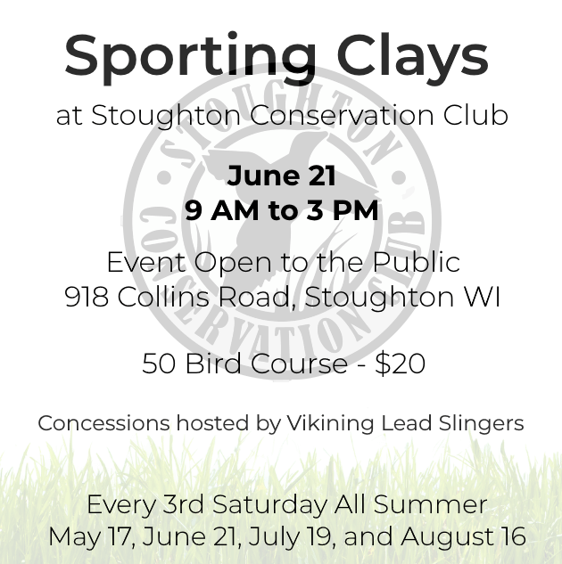 Sporting Clays – June 21, 2025 June 15, 2025 by Kevin Kettner The next Sporting Clays Event at Stoughton Conservation Club is June 21! Open to the public! When: June 21 – 9 AM to 3 PM Where: 918 Collins Road, Stoughton, WI Cost: $20 (optional Lewis Class: $5) Concessions hosted by Viking Lead Slingers