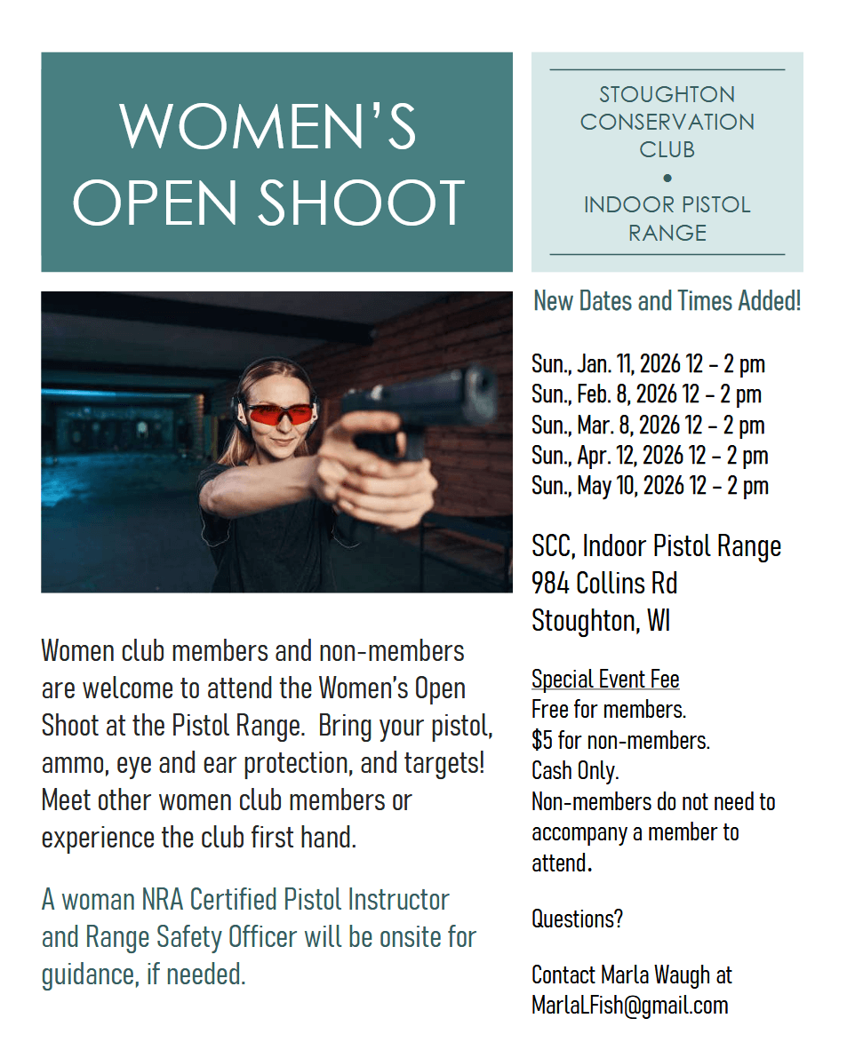 Women club members and non-members are welcome to attend the Women’s Open Shoot. Event fee of $5 for non-members. Cash only.